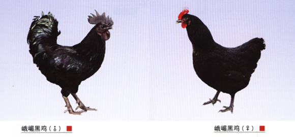 主要特性:峨嵋黑鸡属蛋肉兼用型鸡种。体型较大,体态浑圆,全身羽毛黑色,着生紧密,具金属光泽。大多峨嵋黑鸡呈红色单冠,少数有红色豆冠或紫色单冠或豆冠。虹彩橘红色,少数栗色。部分峨嵋黑鸡有胫羽,喙、胫、趾黑色,极少数峨嵋黑鸡颔下有胡须。峨嵋黑鸡皮肤白色,偶有黑皮肤个体。成年峨嵋黑鸡体重:公2832克,母2226克。成年公峨嵋黑鸡全净膛80.3%,胸腿肌占41.3%,成年母峨嵋黑鸡全净膛71%,胸腿肌占39.2%。峨嵋黑鸡开产日龄186天,年产蛋120个,蛋重54克,蛋壳呈褐色或浅褐色。