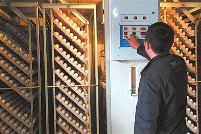 9、晾蛋:在孵化中、后期,蛋温可达38.8℃,蛋壳表面积相对小,气孔小,散热缓慢,此时期晾蛋可加强胚胎的气体交换,排除蛋内积热,孵化16天后,应每天晾蛋2次,晾蛋时间长短不等,根据情况灵活掌握,当蛋温降至35度时继续孵化。