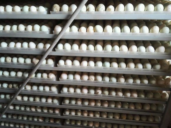 (3)翻蛋 在入孵后第1-26天,每隔2-3h要翻蛋一次,每日翻蛋8-12次,翻转角度为90度,以使胚胎各部分受热均匀,防止胚胎黏壳。如果孵化机内各处温差±0.5℃,则每日要调盘一次,即上下蛋盘对调,蛋盘四周与中央的蛋对调,以弥补温差的影响。